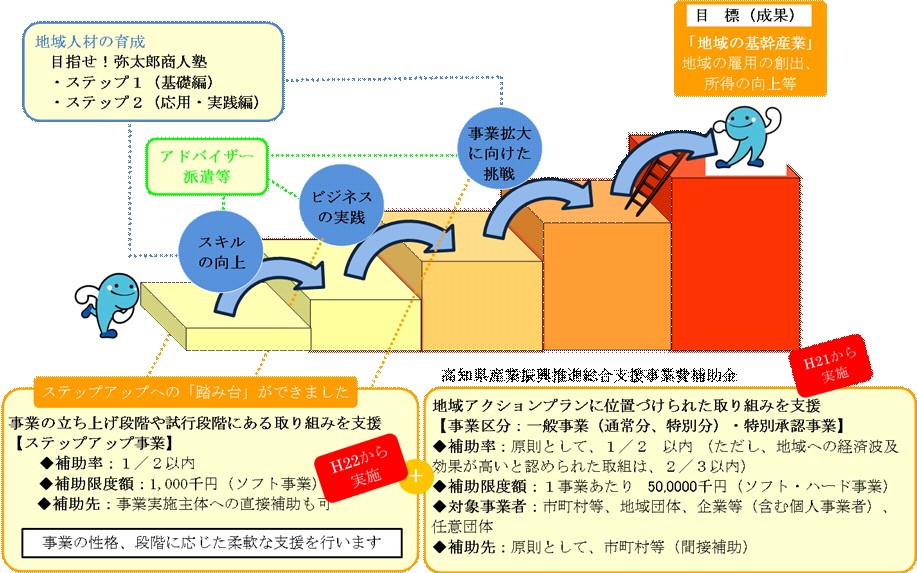 そのほか、昨年度から実施している産業振興アドバイザーによる、組織づくりや商品開発、生産・流通・販売面での指導・助言に加えて、ビジネスの基礎知識から応用・実践力まで習得できる講座の開設(目指せ!弥太郎商人塾)など、いろいろな支援ツールを用意しました。
