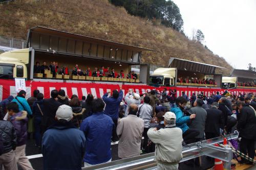 開通当日は、知事や地元関係者、国会議員、自治体関係者など約300人が出席した開通式典の後、窪川中学校生徒によるブラスバンド演奏、餅投げ、通り初めが行われ、多くの地域住民の方々でにぎわいました。