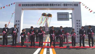 開通当日は、香南市の香我美中学校で、知事や地元関係者、国会議員、自治体関係者などが出席した開通式典が開催された後、香南かがみICでテープカットや獅子舞、餅投げ等、開通を記念したセレモニーが盛大に行われました。