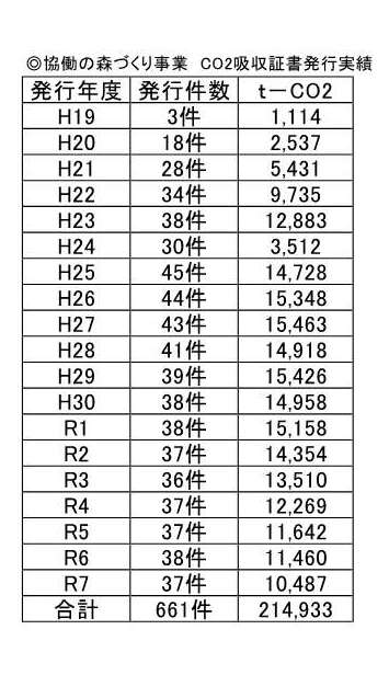 右下の表のとおり、協働の森づくり事業が始まってからこれまで、214,933tーCO2(約5万76百世帯の1年分のCO2排出量)の吸収証書が発行されました。証書をHPや広報等に掲載いただいている企業もいらっしゃいます。
