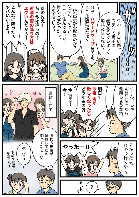 ・父への説得と娘達の下心との漫画的な展開の中で、早めの避難を啓発しているところが面白い。
