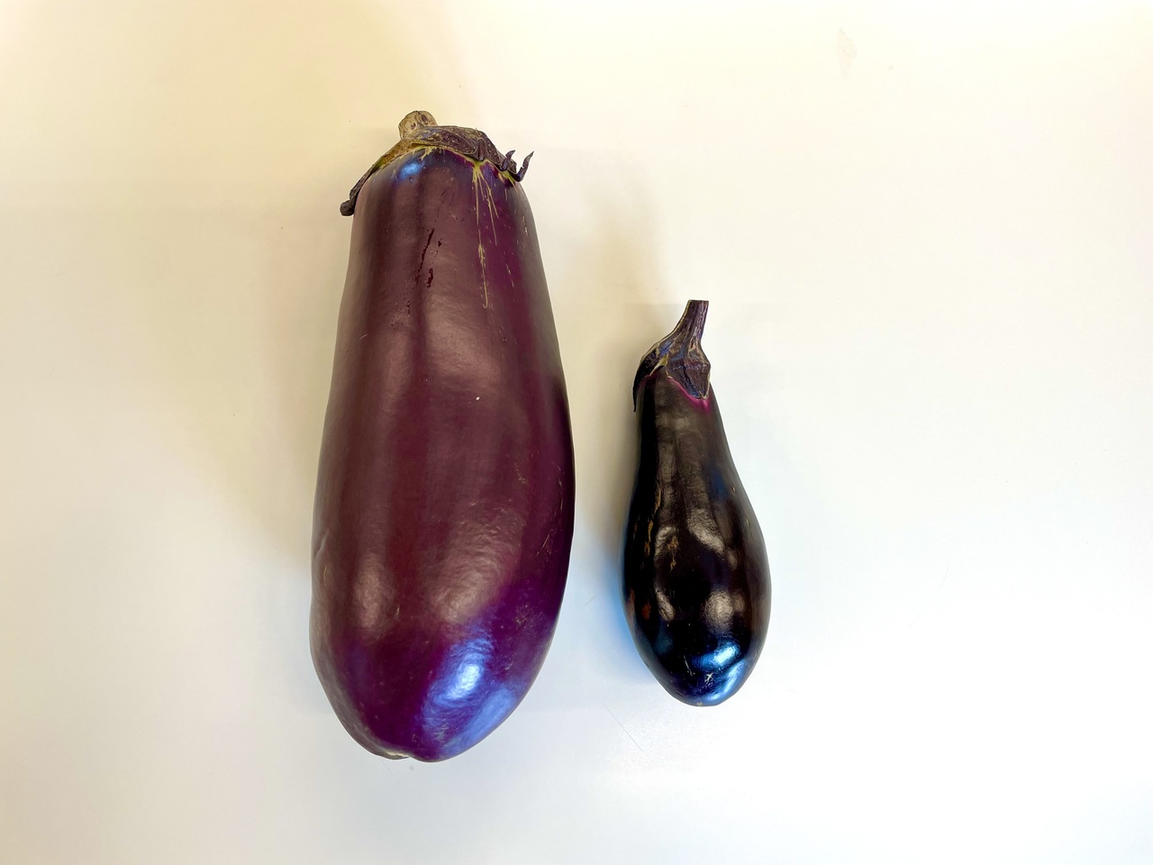 [左が「ぼたなす」、右が通常の高知ナスです。]
