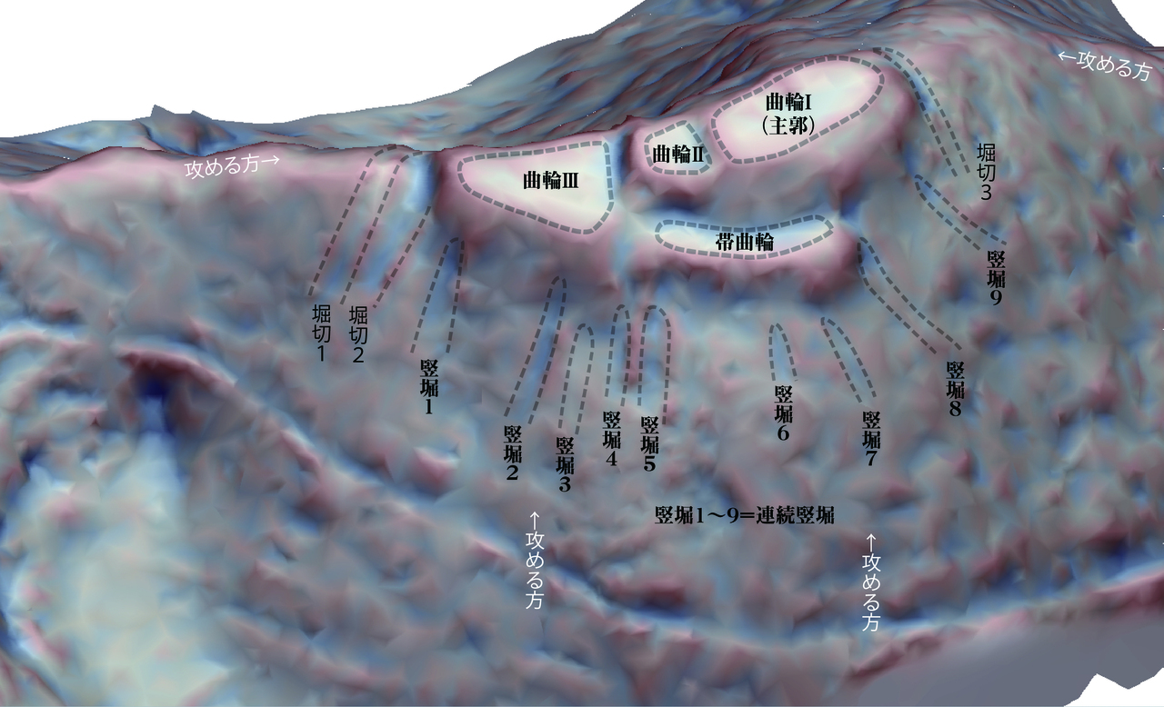 南路志などに記載されている長宗我部氏が攻めてきたときに、「一条殿が北之山傳ひに塩塚の城へ御のき」という城はタキモト城跡の可能性があり、その時にはすでに連続竪堀も構築されていたと考えてもよさそうです。里の城が、もともと敷地氏の出城で出土遺物からみると15世紀後半ごろから機能していたと考えています。そして、一条氏の家臣である敷地氏が、16世紀に入ってから明確な時期はわかりませんが、境目の城として連続竪堀を駆使してタキモト城を構築したのではないかと思っています。