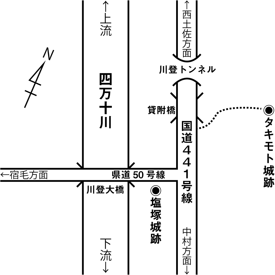 四万十市の川登に、塩塚城跡が所在しています。昭和61年に実施された塩塚城跡の発掘調査報告書では、本城は里の城でこれに対してタキモト城は里の城の出城と考えられており、二つの城を塩塚城と言っています。里の城からタキモト城へは、丘陵伝いに移動することが可能で、タキモト城の方が高所(標高90m)にあり、タキモト城から里の城(標高50m)全体を一望することが可能であると報告書で述べられていますが、はたして里の城とタキモト城跡は同時期に機能していたのだろうかと疑問に思いました。里の城は、発掘調査で年代をある程度推測できる遺物が出土しているためわかりますが、発掘調査されていないタキモト城跡は、同時期に機能したといえる根拠があるのだろうかと思い、タキモト城跡に触れてある史料をあたってみました。