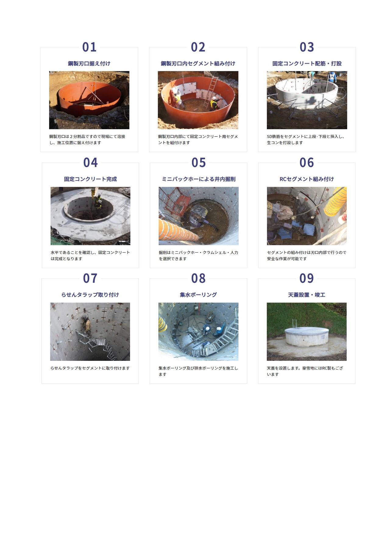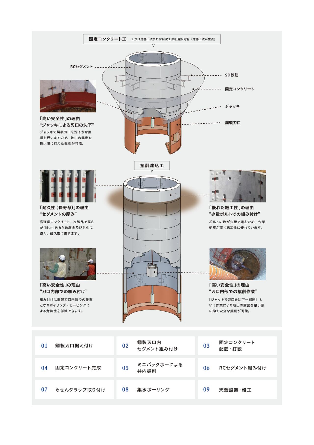 | ① 使用する部材(RCセグメント、鋼製刃口) | ② RCセグメント型集水井工法について | ③ 施工フロー |