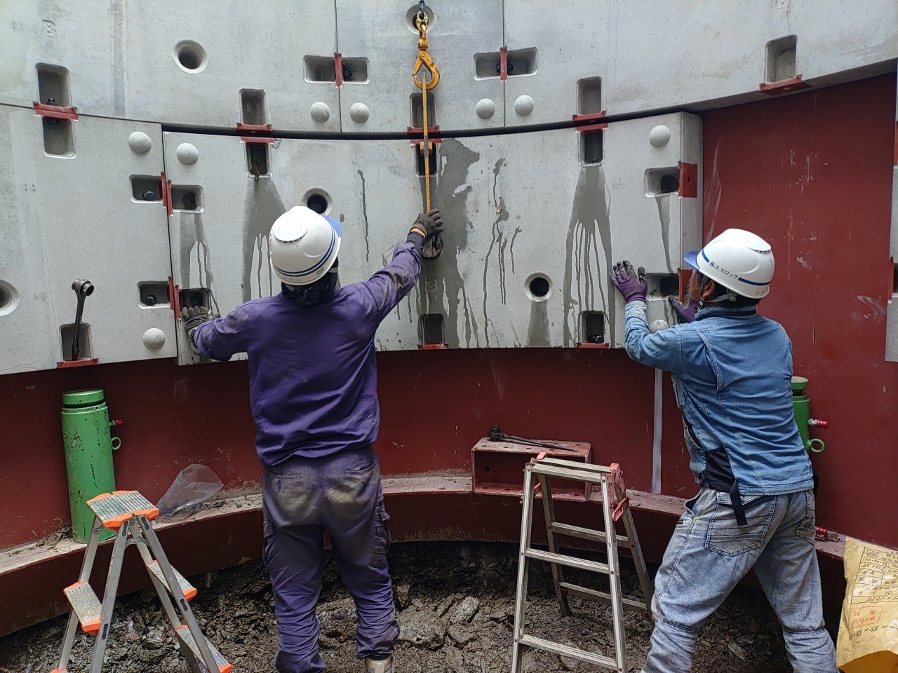 「RCセグメント型集水井」は、鋼製刃口をジャッキによって押し込みながら掘削をして、刃口内で鉄筋コンクリート製のセグメントと呼ばれる部材を組み立てて集水井を構築する工法です。この工法はセグメントの構築を刃口内でおこなうため、安全性に優れています。
