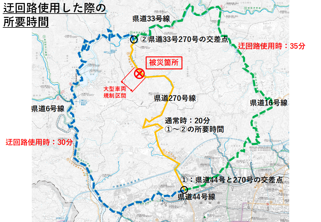 ※被災箇所(仮復旧箇所)周辺は狭小となっており、大型車両の通行が困難となります。