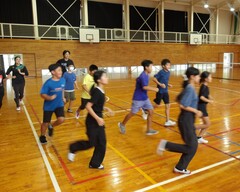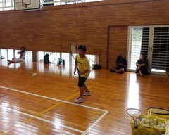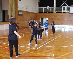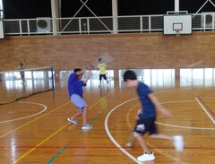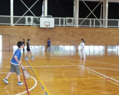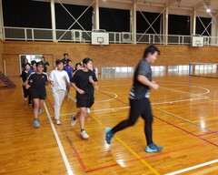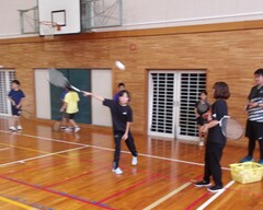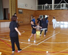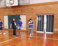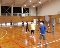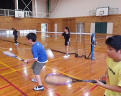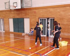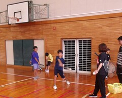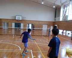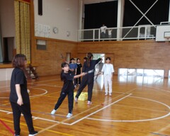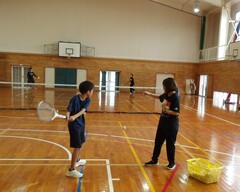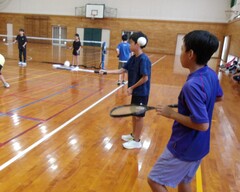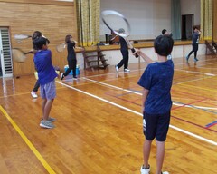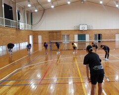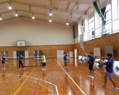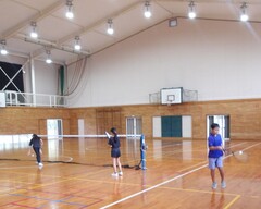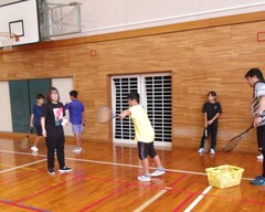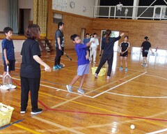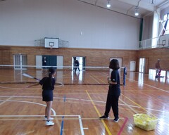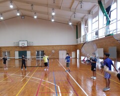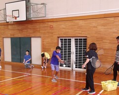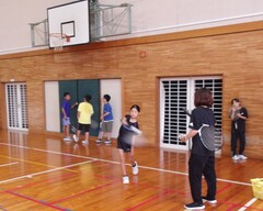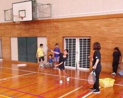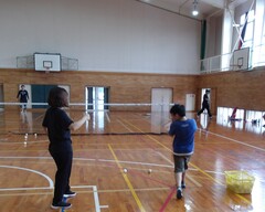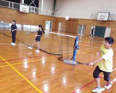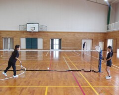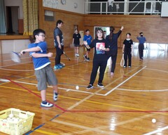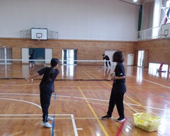 今回のソフトテニスの体験は、雨天のため三原中学校の体育館(写真:下)で実施しました。