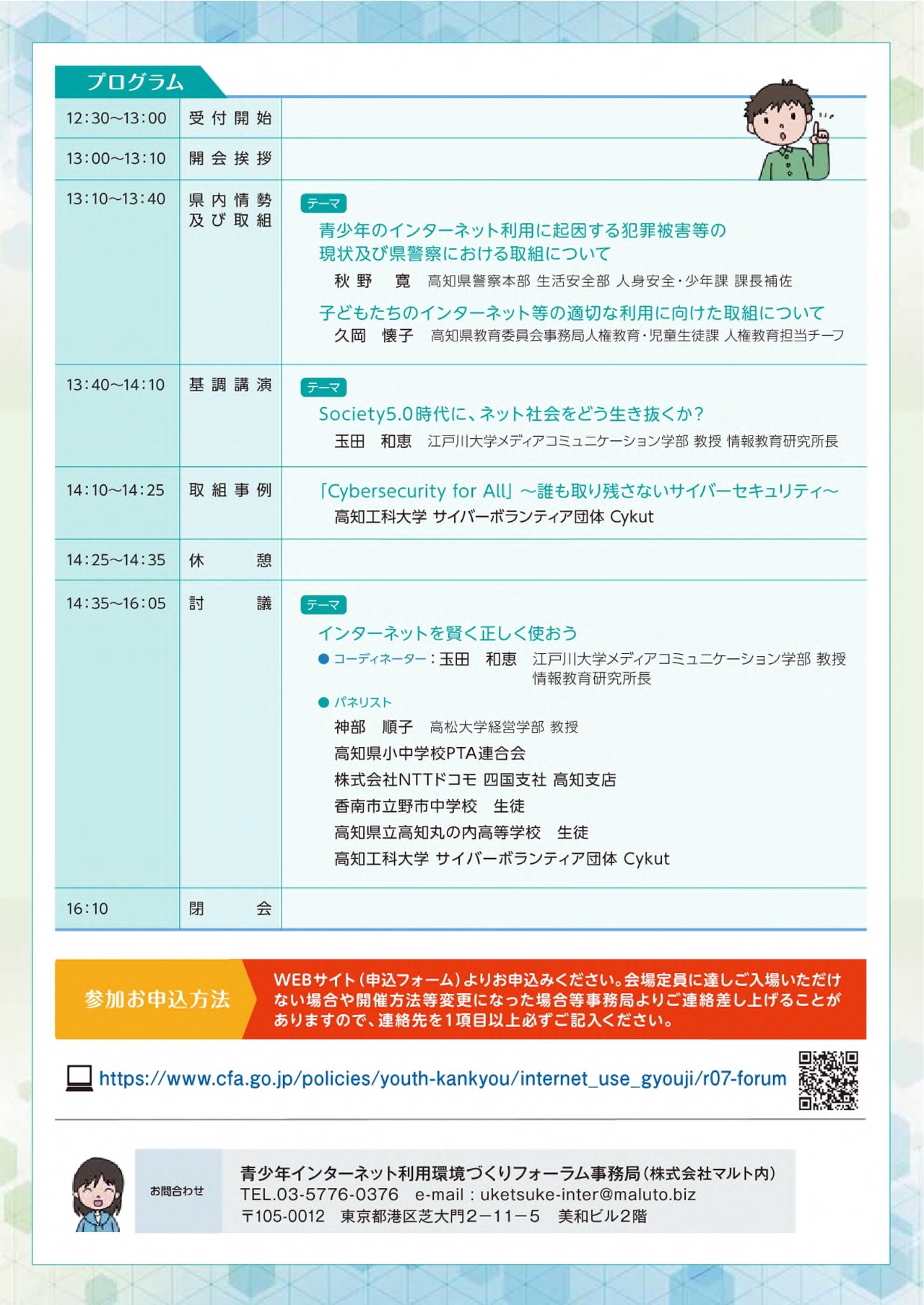 フォーラムでは、基調講演や取組発表のほか、中高生などによるパネルディスカッションを行い、青少年がインターネットを賢く正しく利用するにはどうしたらよいか、こどもと大人が一緒になって考えます。