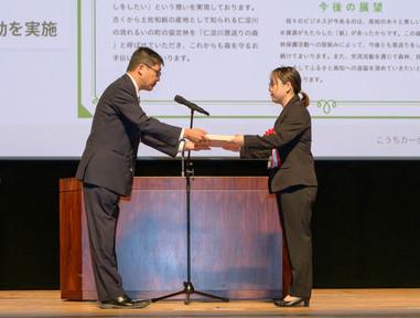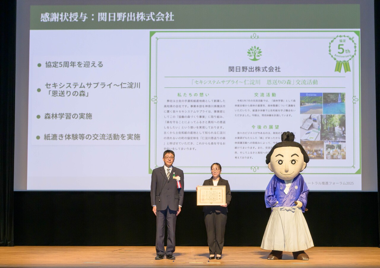 令和7年11月11日(火曜日)に開催された『こうちカーボンニュートラル推進フォーラム2025』において、協働の森づくり事業表彰式が行われ、協定締結から5周年を迎えた関日野出株式会社様に感謝状の贈呈を行いました。