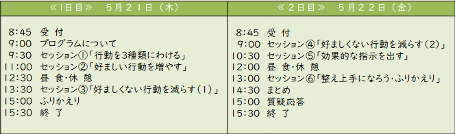 このセミナーでは、2日間の講義と演習を通して、ペアレント・トレーニング(ティーチャーズ・トレーニング)全6回セッションのプログラム内容とその進め方を学びます。
