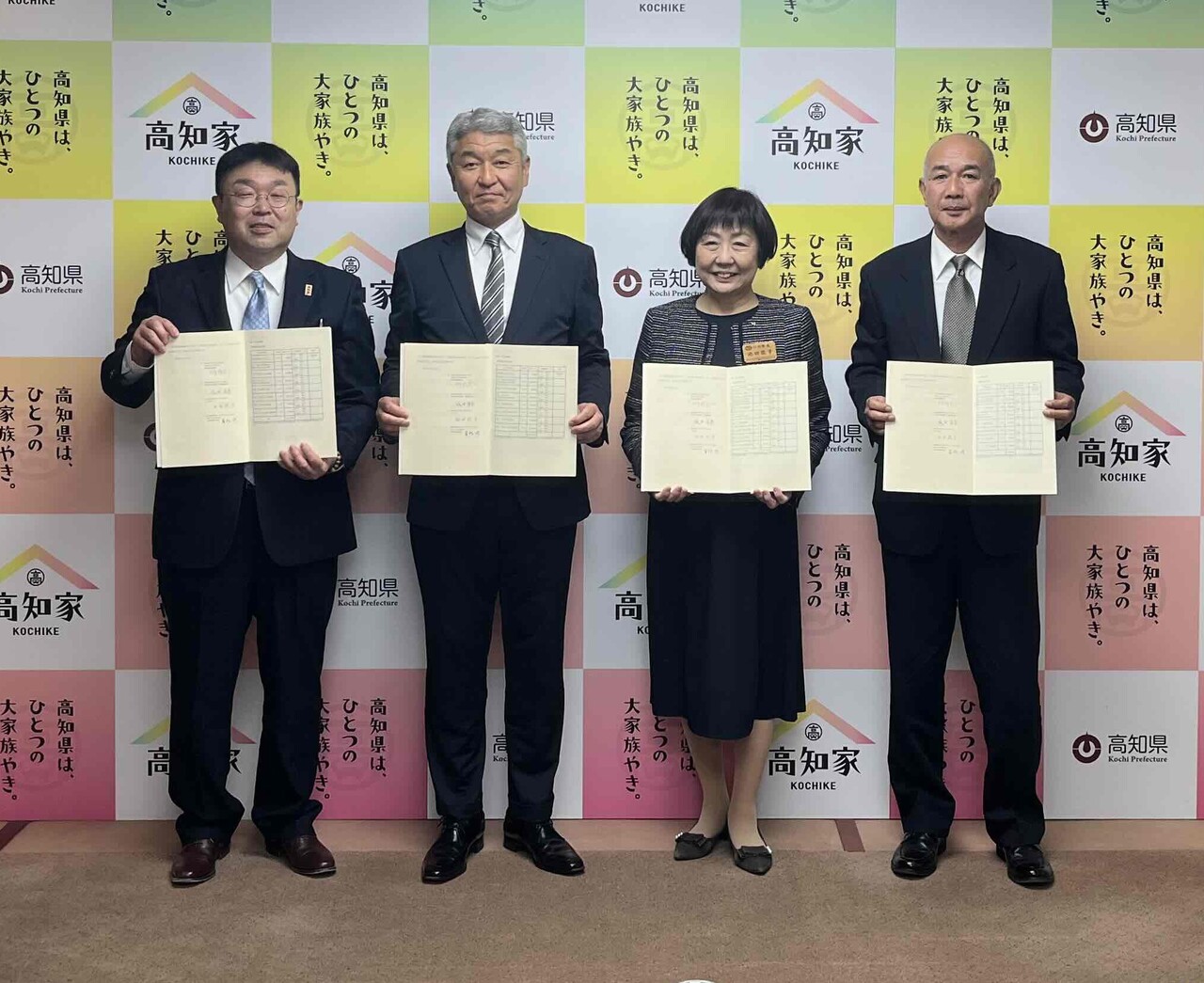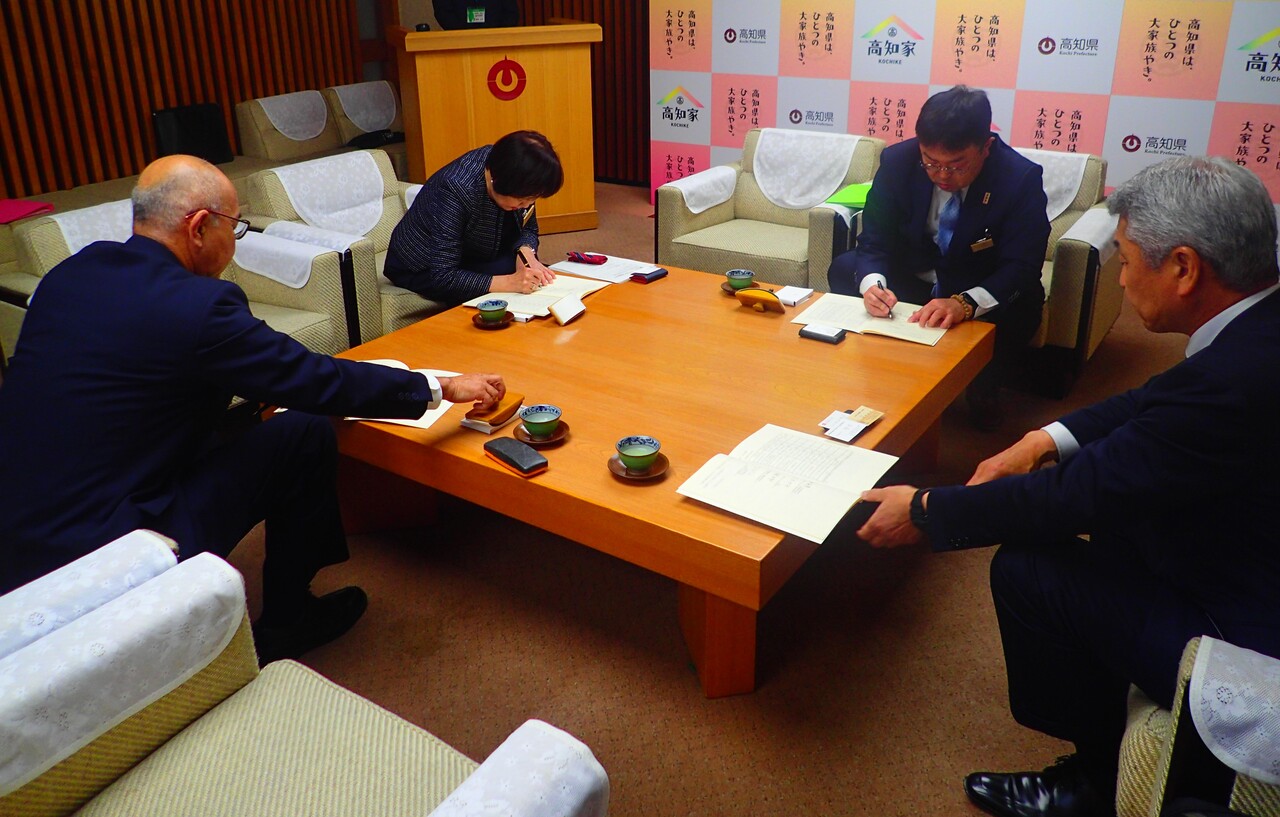 【左から、坂田部長、板垣取締役総務部長、池田いの町長、曽我代表理事組合長】
