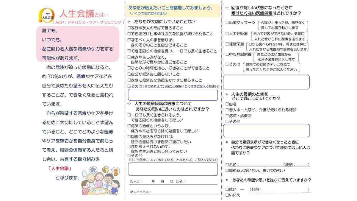 住民の皆様はもちろん、医療・介護等従事者の皆様にも是非ご活用していただき、人生会議(ACP)の参考としてご利用ください。