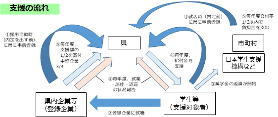 登録した学生等が登録企業に就職して支援対象者として認定を受けた後、毎年度の奨学金返還額の一部を、翌年度に給付金として県から支援対象者に支給します。