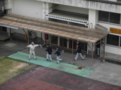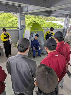 まずは本館屋上に訓練生及び職員全員で避難し、当校の備蓄品などの説明を聞きました。