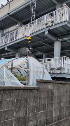 その後、砂地避難タワーへ移動し、高知市地域防災推進課の職員の方から簡易トイレ、防災無線等の設備品についての詳しい説明や緩降機の実演を見学しました。