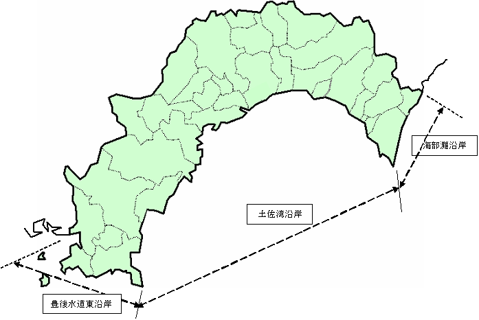高知県の海岸線は延長約713kmで東西に長く、南に突き出した室戸岬、足摺岬により、海部灘沿岸、土佐湾沿岸、豊後水道東沿岸の3沿岸に区分されます。県中央部を縦断する仁淀川の河口を境にして、東は浦戸湾周辺の平野を除くとほとんどが隆起海岸であり、西は浦ノ内湾や須崎湾をはじめ沈降による入り江が多く、山と絶壁が海岸線に迫るリアス式海岸が続いています。 |