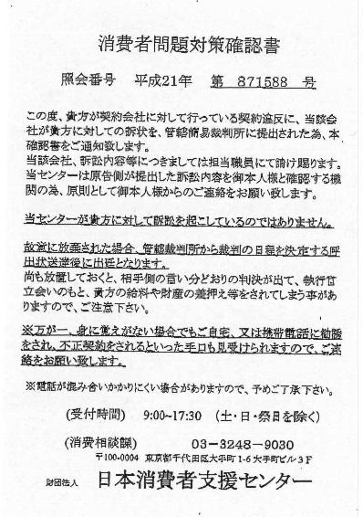 | 東京管理事務局 | 日本消費者支援センター【実物例】 |