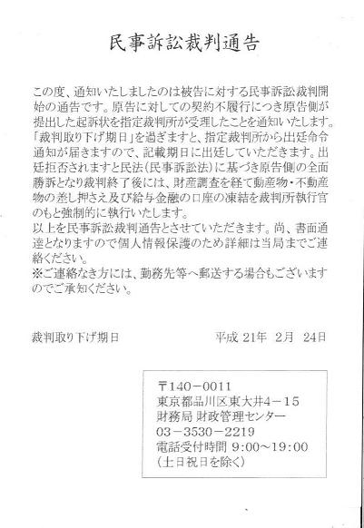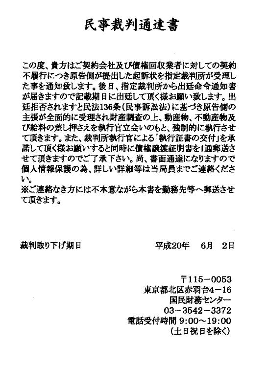 | 国民財務センター【実物例】 | 管財事務局執行第二部 |