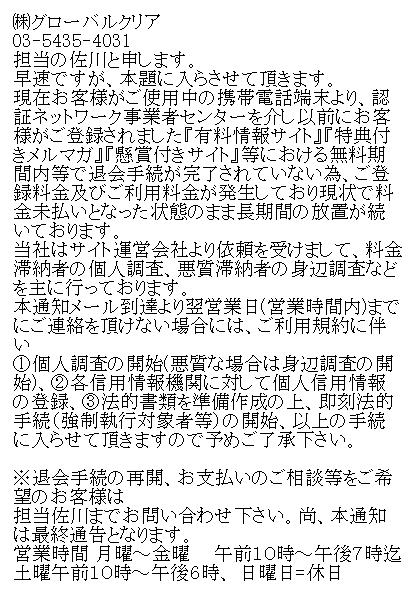 【業者名:グローバルクリア】(携帯メール)
