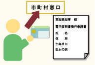 電子証明書を入れるためのICカードを持って、お住まいの市町村窓口に行き、電子証明書発行申請書を提出します。 |