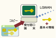公開鍵を受け取った受付窓口担当者は基本4情報と一緒にLGWAN(総合行政ネットワーク)を介して発行者である知事に送信します。 |