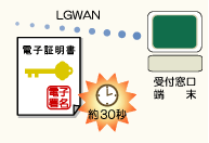 知事は、知事の電子署名(公印にあたるもの)をつけた電子証明書を発行し、受付窓口端末にLGWAN(総合行政ネットワーク)を介して返信されます。 |