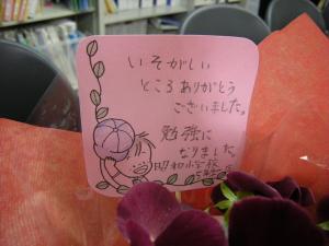 昭和小学校の皆さんから、見学会のお礼ということで生徒たちが育てたパンジーの鉢植えをいただきました。
