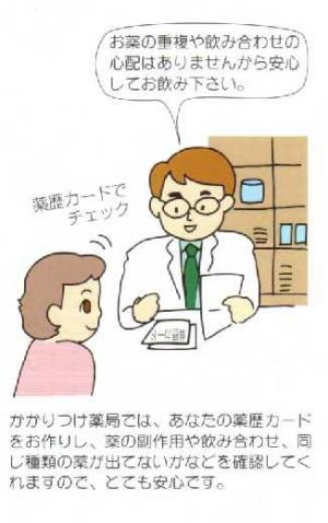 医師が患者さんの診断治療のためにカルテを役立てているように、薬局では、患者さんが服用している薬、体質、薬物アレルギーなどを記録し、患者さんに応じた服薬の指導を行い、また複数の医療機関から出された薬あるいは大衆薬などとの重複あるいは飲み合わせ(相互作用)などをチェックするのに役立てています。