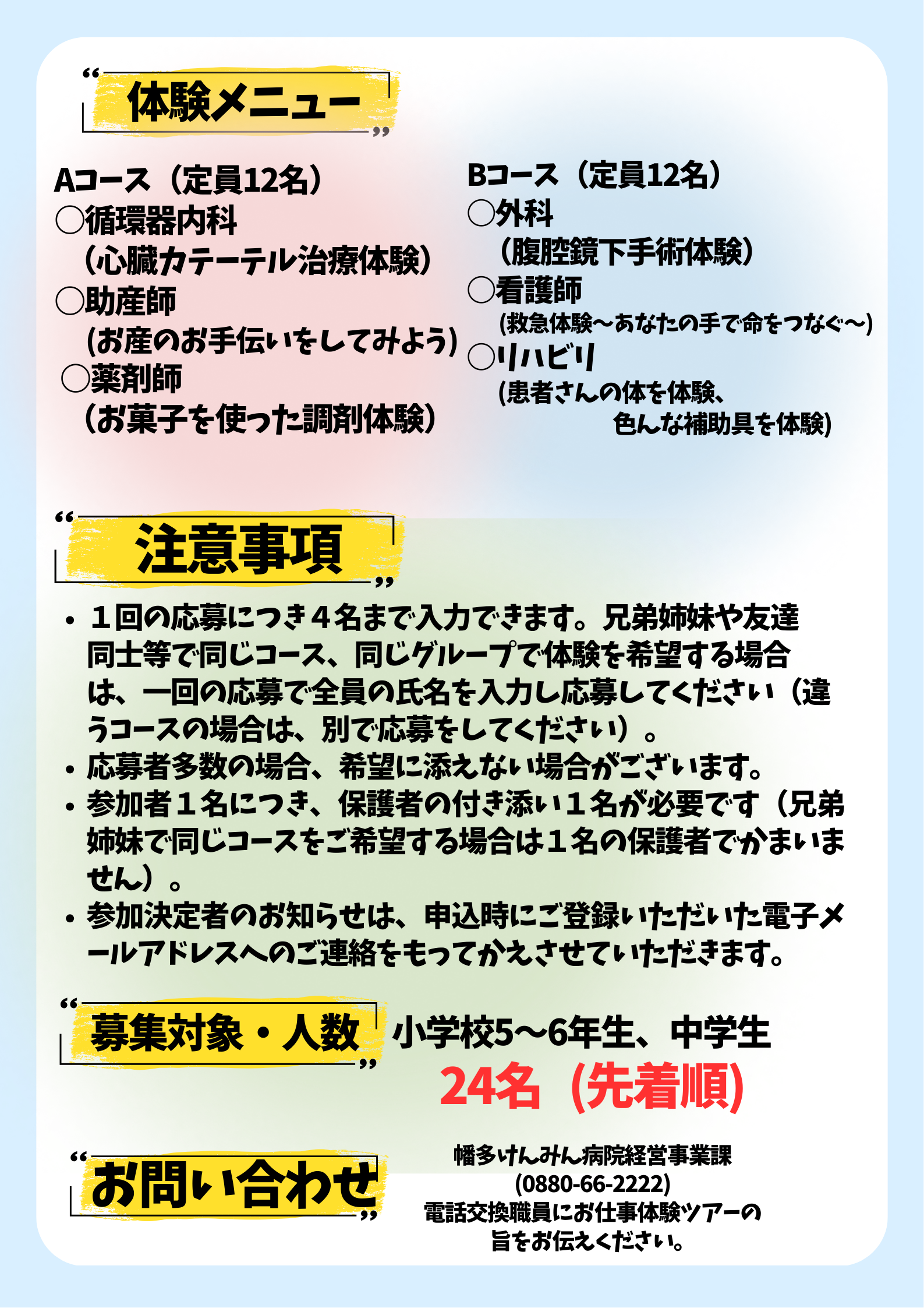 幡多けんみん病院経営事業課(0880-66-2222 → 電話交換職員にお仕事体験ツアーの旨をお伝えください)