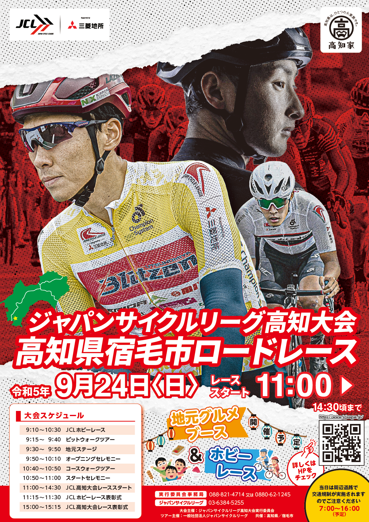 令和5年9月24日(日)に宿毛市で昨年に引き続き開催するジャパンサイクルリーグ高知大会について、以下の新たな取組など大会運営全般の確認を行います。 (今年度の新たな取組) ・スタート・フィニッシュ会場でのパブリックビューイングの実施 ・片山右京氏のサイン入りサイクルジャージ等が当たる来場者向け抽選会の実施 ・自動車専用道路を間近に観る側道観戦スポットの設置 ・シャトルバスの運行(スタート・フィニッシュ会場と側道観戦スポット等を結ぶバス)