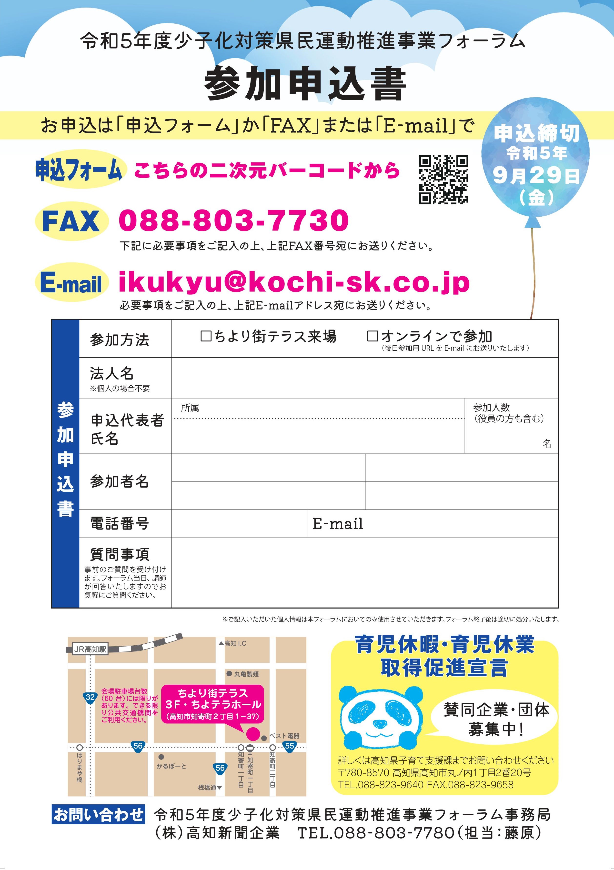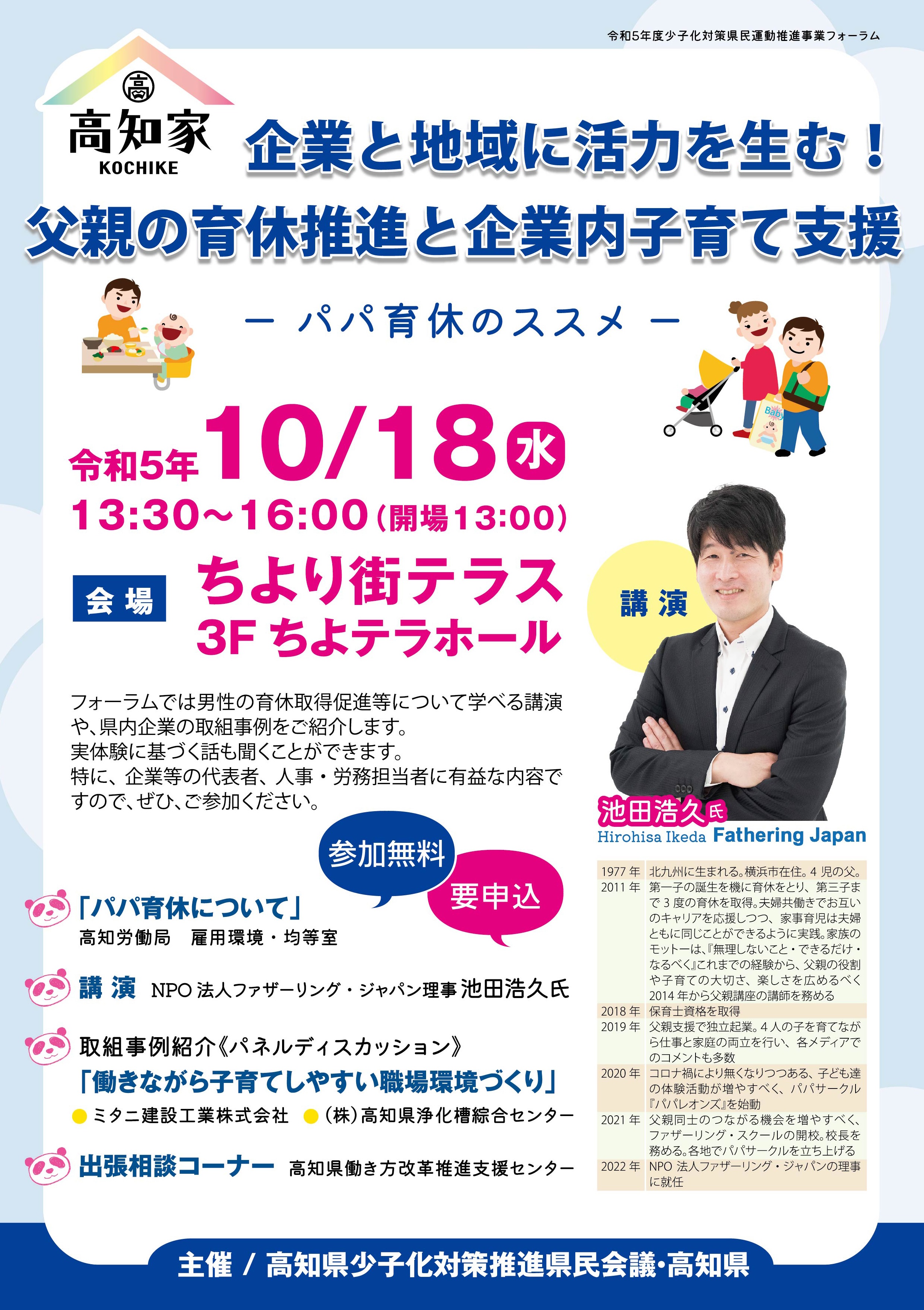 県内企業における子育てを応援する機運を高め、県民運動につなげることを目的として、当該フォーラムを開催します。 県内外の企業の取組事例の紹介や、育休取得者、大学生らによるパネルディスカッションを行うなど、育児休業等を取得しやすい環境の整備や社会全体での機運醸成を図ります。 リアルタイムのオンライン配信も実施しますので、自宅や職場などから、フォーラムを視聴することができます。 ◆プログラム (1)開会 (2)開会挨拶 高知県少子化対策推進県民会議 会長 西山 彰一 (3)ビデオメッセージ 高知県知事 濵田 省司 (4)パパ育休の制度説明 高知労働局 (5)基調講演「企業と地域に活力を生む!父親の育休推進と企業内子育て支援」 講師:NPO法人ファザーリング・ジャパン理事 池田 浩久 氏 (6)取組事例紹介 ・ミタニ建設工業株式会社 ・株式会社高知県浄化槽綜合センター (7)パネルディスカッション パネリスト ・株式会社高知県浄化槽綜合センター代表取締役社長 岡本 公平 氏 ・ミタニ建設工業株式会社 総務部人事課 中島 由貴 氏 舗装部 伊野上 功樹 氏 ・比島交通公園 園長 山崎 勇人 氏 ・高知大学 地域協働学部地域協働学科3年 奥住 翼 氏 (8)閉会