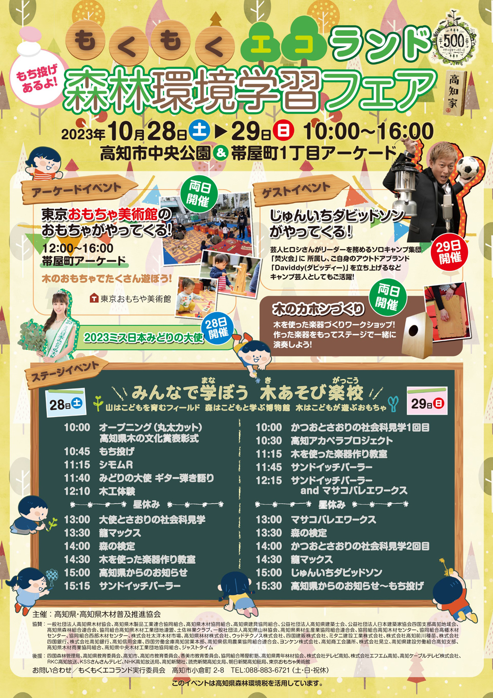 ○内容(一例) (ステージ) ・じゅんいちダビッドソンのトークショー(キャンプ×森林) ・森の博士の検定試験に挑戦する森の検定 ・木工体験(バードカービング) ・木を使った楽器作り教室 ・ミス日本みどりの大使 ギター弾き語り (ブース) ・林業機械の展示・実演 ・木のおもちゃコーナー ・段ボール家づくり ・木のカホンづくり ・紙すきワークショップ など (帯屋町一丁目アーケード) ・東京おもちゃ美術館による木のおもちゃの展示及び体験ブース ○目的 幅広い方々に森林の持つ多面的機能や森林環境の保全の重要性を理解していただき、木材利用や森林への関心を深めていただく機会とする ○主催 高知県・高知県木材普及推進協会