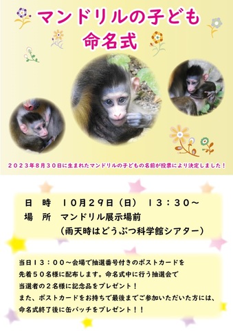 8月30日にのいち動物公園で生まれたマンドリルの子どもの名前を発表します。 担当者が、写真を交えながらマンドリルの子どもの成長記録を紹介します。 命名式の最後に行う抽選会では、当選者の方から一言いただく予定です。
