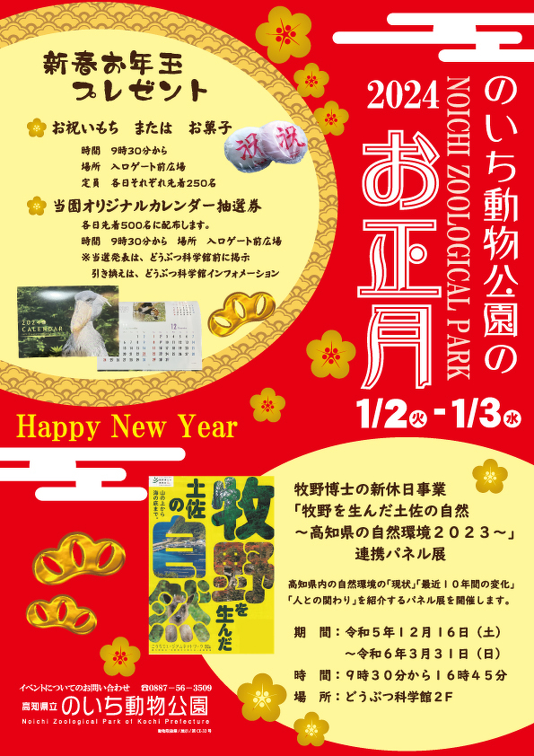 ■年末年始の休園日について 休園日:令和5年12月29日(金)~令和6年1月1日(月) ■お正月イベントについて 内容:紅白餅またはお菓子をプレゼントします。 また、同時にカレンダー抽選券を配布します。園内にカレンダーの当選番号を掲示 し、当選された方にはどうぶつ科学館でカレンダーをプレゼントします。 日時:令和6年1月2日(火)~令和6年1月3日(水) 9:30~なくなり次第終了 場所:入り口ゲート 定員:紅白餅またはお菓子(カレンダー抽選券付き):各日それぞれ先着250名ずつ ■取材について 取材ご希望の場合は事前にご連絡をお願いします。 ◎お問い合せ 高知県立のいち動物公園 0887-56-3509 総務企画課 北村・林まで