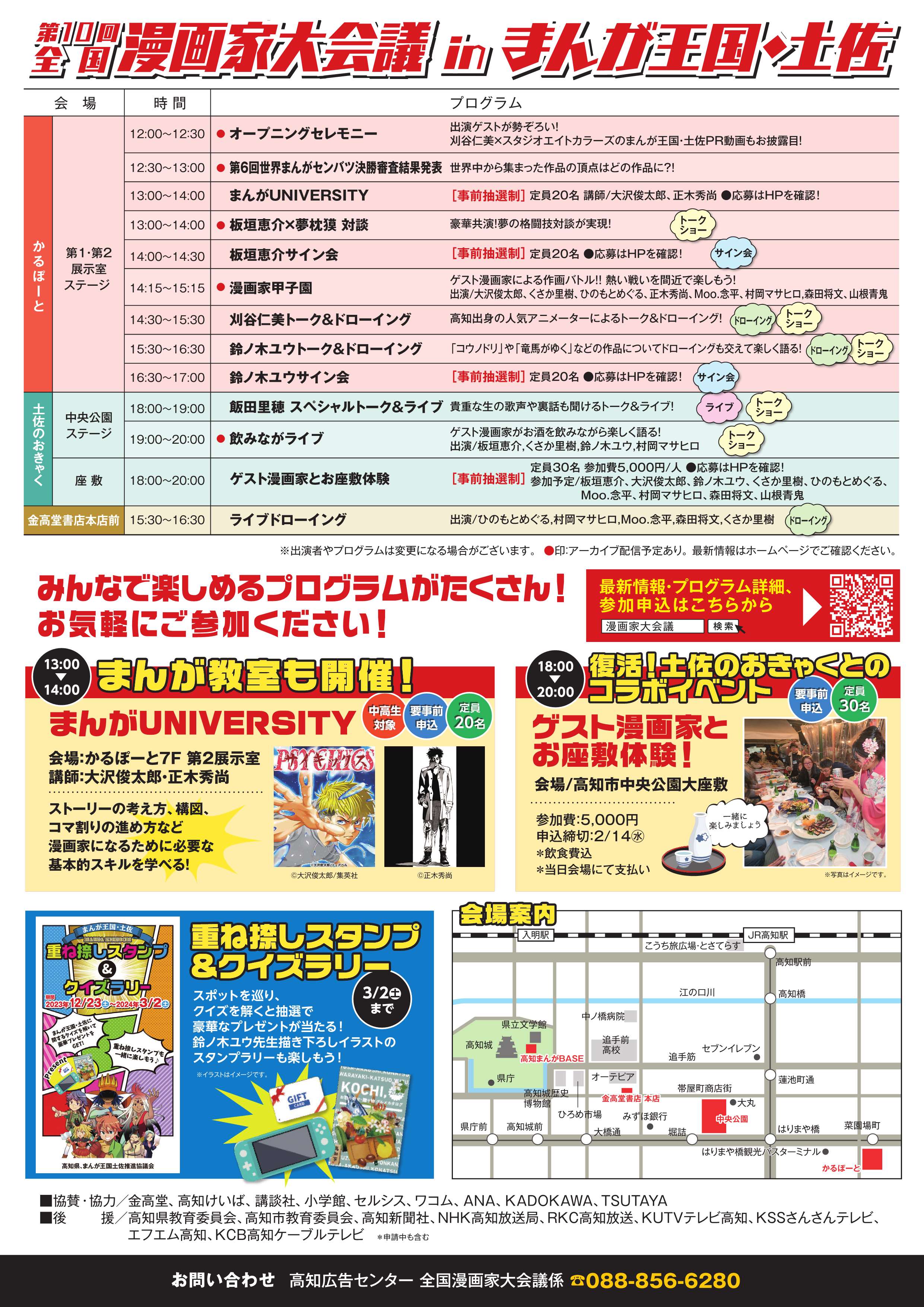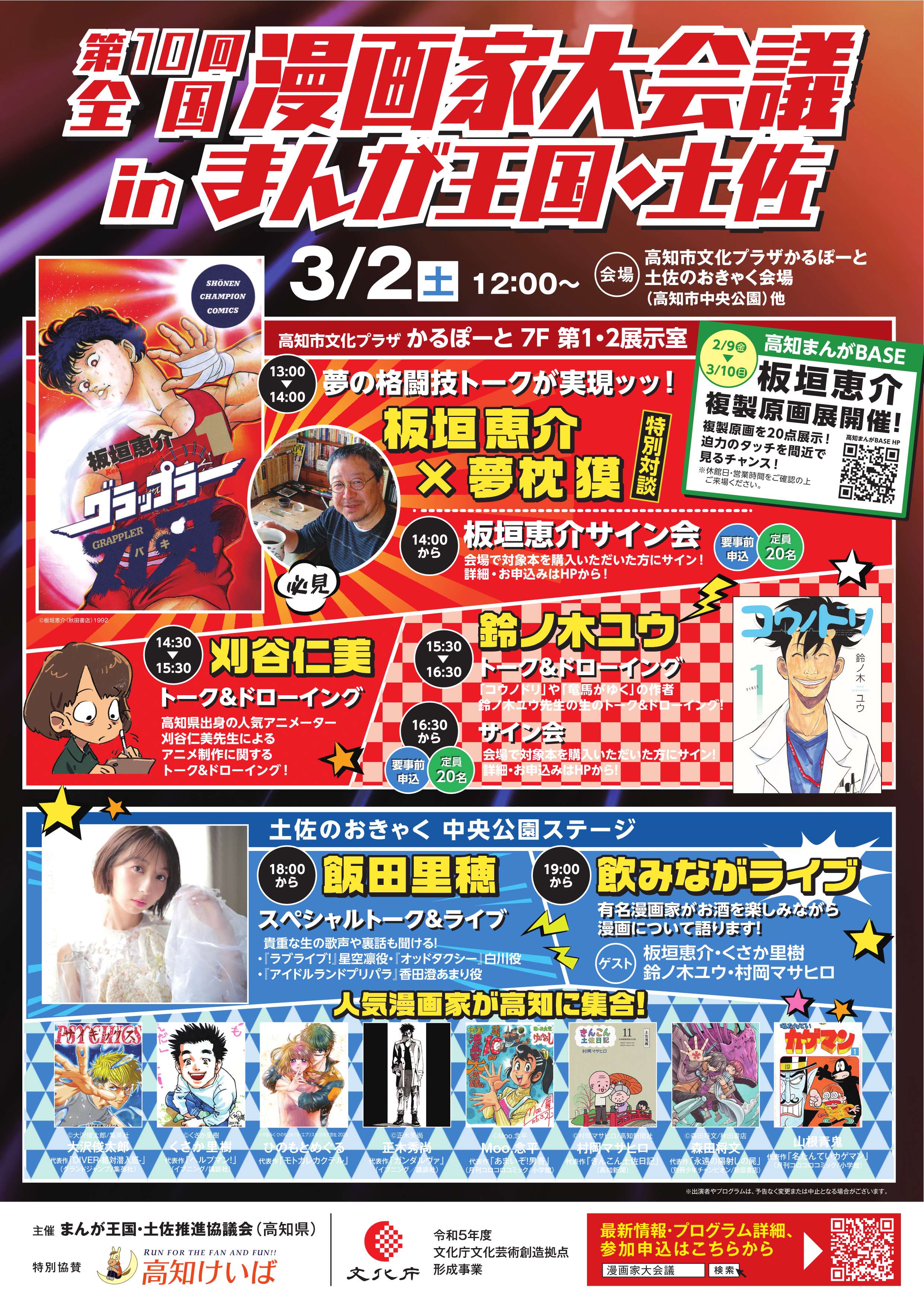 第10回全国漫画家大会議 in まんが王国・土佐の関連企画として、板垣恵介氏の複製原画展開催にあたり、県担当者による取材対応を行います。 【日時】 2月9日(金)12:00~14:00 【場所】 まんが王国・土佐情報発信拠点 高知まんがBASE1階まんが読書コーナー ※複製原画展会場 【対応内容】 上記時間にお越しいただいた方に個別に対応させていただきます。 会場に直接お越しください。 【その他情報】 <開催期間> 令和6年2月9日(金)~3月10日(日) ※高知まんがBASEの開館日(下記)のみ観覧可能 月・水・金 12:00~18:00 土・日・祝 10:00~17:00 <入館料等> 無料