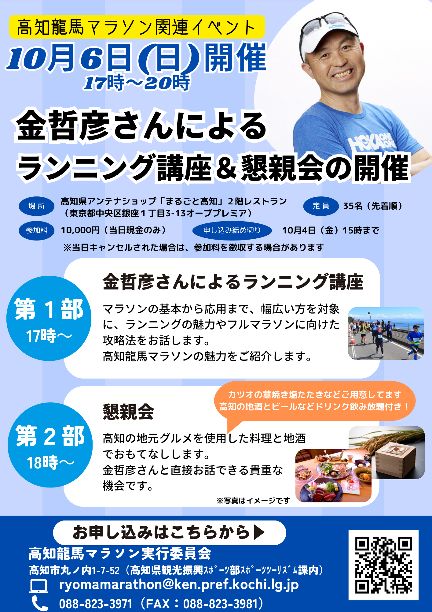 【開催概要】 日 時 : 令和6年10月6日(日) 第1部 17:00~17:55 (16:30~ 受付) 第2部 18:00~20:00 会 場 : 高知県アンテナショップ「まるごと高知」2F レストラン「TOSA DINING おきゃく」 参加料:10,000円(二部のお料理とドリンク飲み放題付き) 定 員:35名(先着順) 内 容: <一部> ・マラソンの魅力から基本から応用までのマラソン攻略法 ・高知龍馬マラソンの特性や魅力の紹介 ・参加者からの質問タイム <二部> ・高知の地元グルメを使用した料理の提供 ・金哲彦さんとの直接対話の機会の提供 講 師:金哲彦さん プロランニングコーチで高知龍馬マラソンの大会アドバイザーと高知県観光特使 (2024年7月就任)を務めます。 早稲田大学時代、箱根駅伝で活躍。山登りのスペシャリストとして、4年連続で 5区を任され、区間賞を2度獲得し、1984(昭和59)年・1985(昭和60)年の優勝 に大きく貢献しました。 大学卒業後も、別府大分毎日マラソンで3位に入るなどの活躍をされ、現在は、 テレビのマラソン・駅伝解説、講演会、ランニングクリニック等を行いながら、 スポーツ振興に関わる幅広い活動をされています。 【メディア取材の申し込み】 当日メディア取材にお越しいただける場合は、事前に社名と担当者のお名前をお問い合わせ先までご連絡ください。 【参考:高知龍馬マラソン2025大会概要】 開催日:令和7年2月16日(日) 種 目:フルマラソン、ペアリレー、ファンラン(1.4㎞) 制限時間:7時間(フルマラソン、ペアリレー)、40分(ファンラン) 参加定員:10,000人(フルマラソン)、300組(ペアリレー)、500人(ファンラン) エントリー期限:令和6年10月31日(木) 公式HP:https://ryoma-marathon.jp/