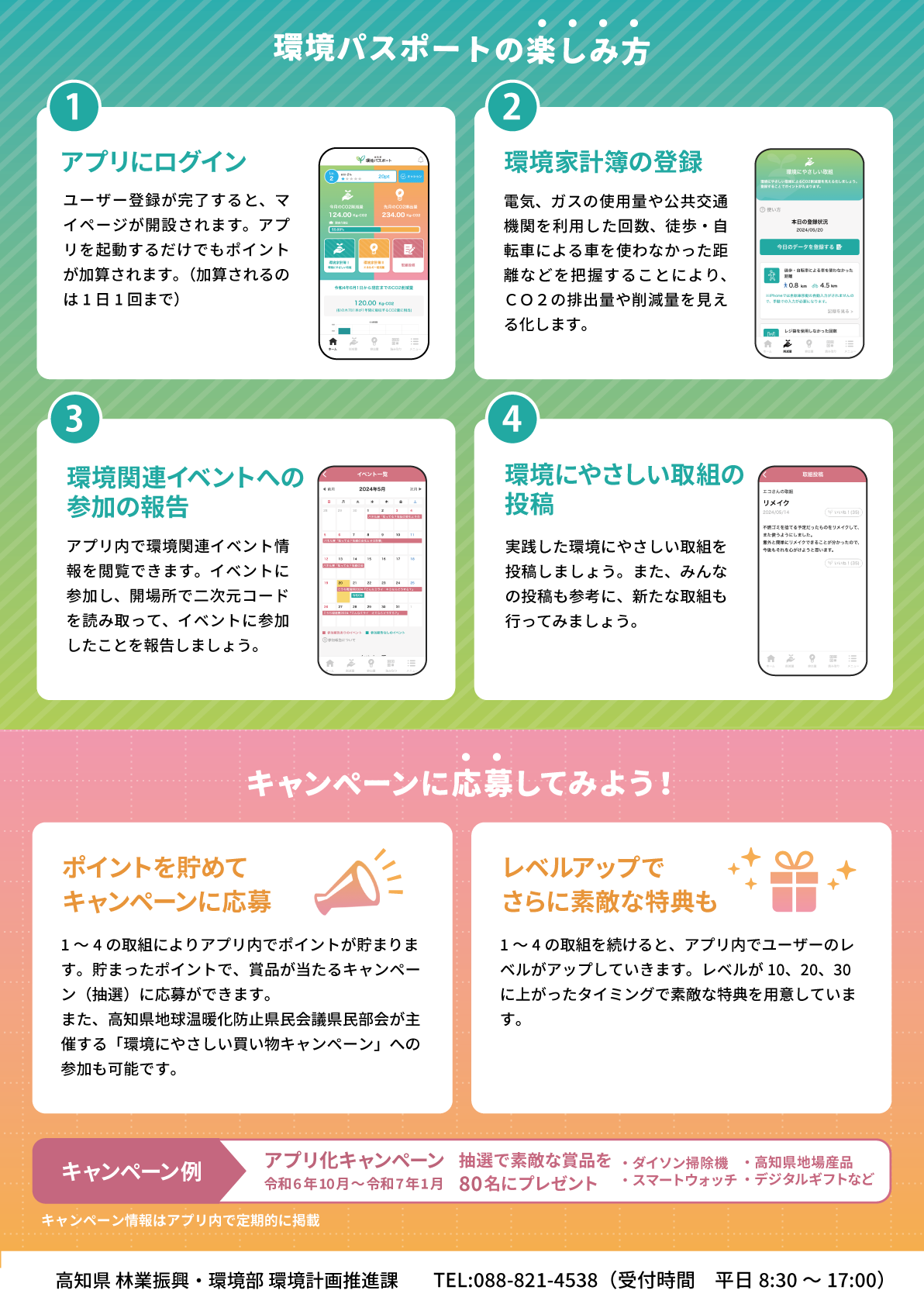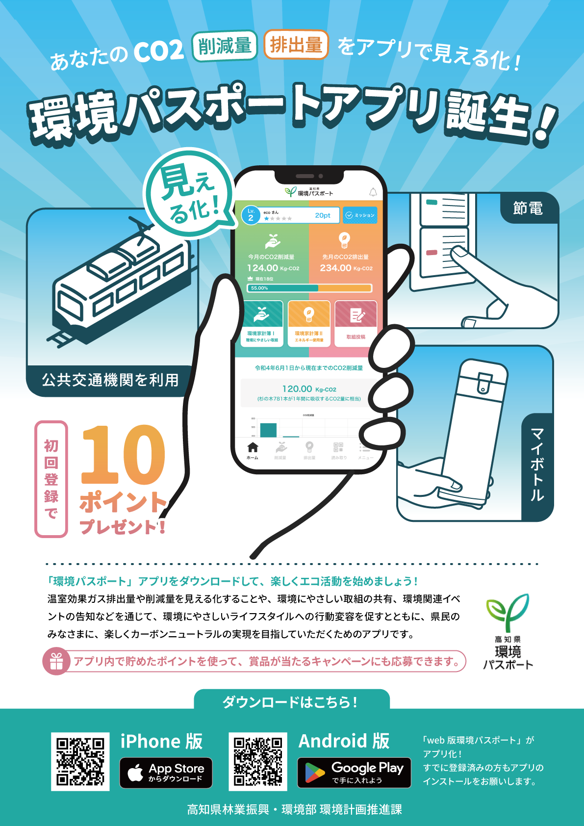 1 目的 県では、令和4年度より環境負荷を見える化するwebサービス「web版環境パスポート」を開始し、省エネルギー行動や再生可能エネルギー導入等の地球温暖化対策を実行に移す県民の増加を推進してきました。 引き続き、「環境パスポート」の認知度を高め、ユーザーを増やすとともに、ユーザーに継続して取り組んでもらい、行動変容を促すことを目的にアプリケーションの運用を10月1日から開始します。 2 「環境パスポート」の機能 電気やガスの使用量、公共交通機関を利用した回数などからCO2排出量や削減量を見える化する「環境家計簿の登録」や、「環境にやさしい取組の投稿」「環境関連イベントへの参加の報告」などを行うと、アプリ内でポイントが貯まります。 貯まったポイントで、賞品が当たるキャンペーン(抽選)に応募することができます。 3 キャンペーンについて アプリ化キャンペーン第1弾を令和6年10月1日(火)~令和6年11月30日(土)の期間で実施します。 アプリをインストールすると10ポイント贈呈、さらにとさでん交通路面電車内に掲載のQRコードの読み取り、アプリ内「環境家計簿Ⅰ」の「公共交通機関を利用した回数」の登録で5~10ポイントをプレゼントします。 10ポイントで1回、ダイソン掃除機やスマートウォッチなど素敵な賞品が80名様に当たる抽選に応募することができます。