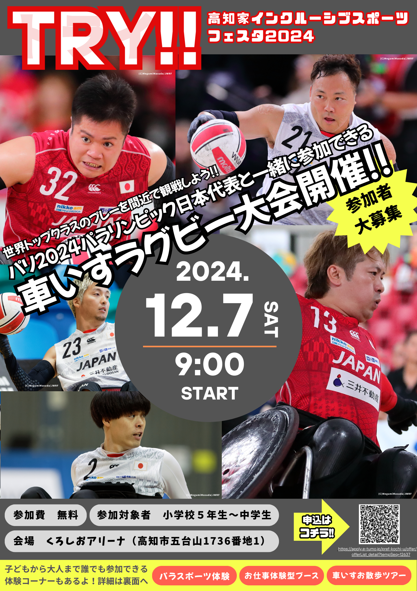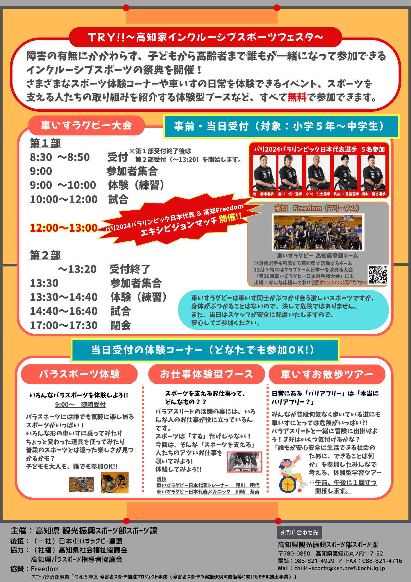 【イベントスケジュール】 8:15 開場 9:00 開会 17:30 閉会 【車いすラグビー大会】 ※事前申込受付中→https://apply.e-tumo.jp/pref-kochi-u/offer/offerList_detail?tempSeq=12637 第1部 8:30~8:50 受付(受付終了後は、第2部受付(~13:20)を開始) 9:00 参加者集合 9:00~10:00 体験(練習) 10:00~12:00 試合 12:00~13:00 エキシビジョンマッチ(日本代表選手とFreedom) 第2部 ~13:20 第2部受付終了 13:30 参加者集合 13:30~14:40 体験(練習) 14:40~16:40 試合 17:00~17:30 閉会 【パラスポーツ体験コーナー】 9:00~ 随時受付 さまざまな種類の車いす体験など数種目を実施予定。 【お仕事体験型ブース】 スポーツを支える仕事の紹介、体験ブース。(時間は当日案内) 講師:車いすラグビー日本代表トレーナー 藤川明代 車いすラグビー日本代表メカニック 川崎芳英 【車いすお散歩ツアー】 車いすの日常を、会場周辺を散歩し段差や悪路など、車いす利用者の困り事を疑似体験。 午前、午後1回ずつ実施。(時間は当日案内) 【その他】 入場、参加、大会の観覧等すべて無料 【取材に関しての注意点】 当日の取材にあたっては、フロア内に記者スペースを用意いたしますので、機材等はスペース内に収めていただくようお願いいたします。 基本的に会場内全般、取材および掲載NGはありませんが、一部車いすラグビー大会の参加者についてはNGの方がいらっしゃる場合があります。その際は、見分ける印を身につけていただく等対応しますが、詳細は当日説明いたします。 -