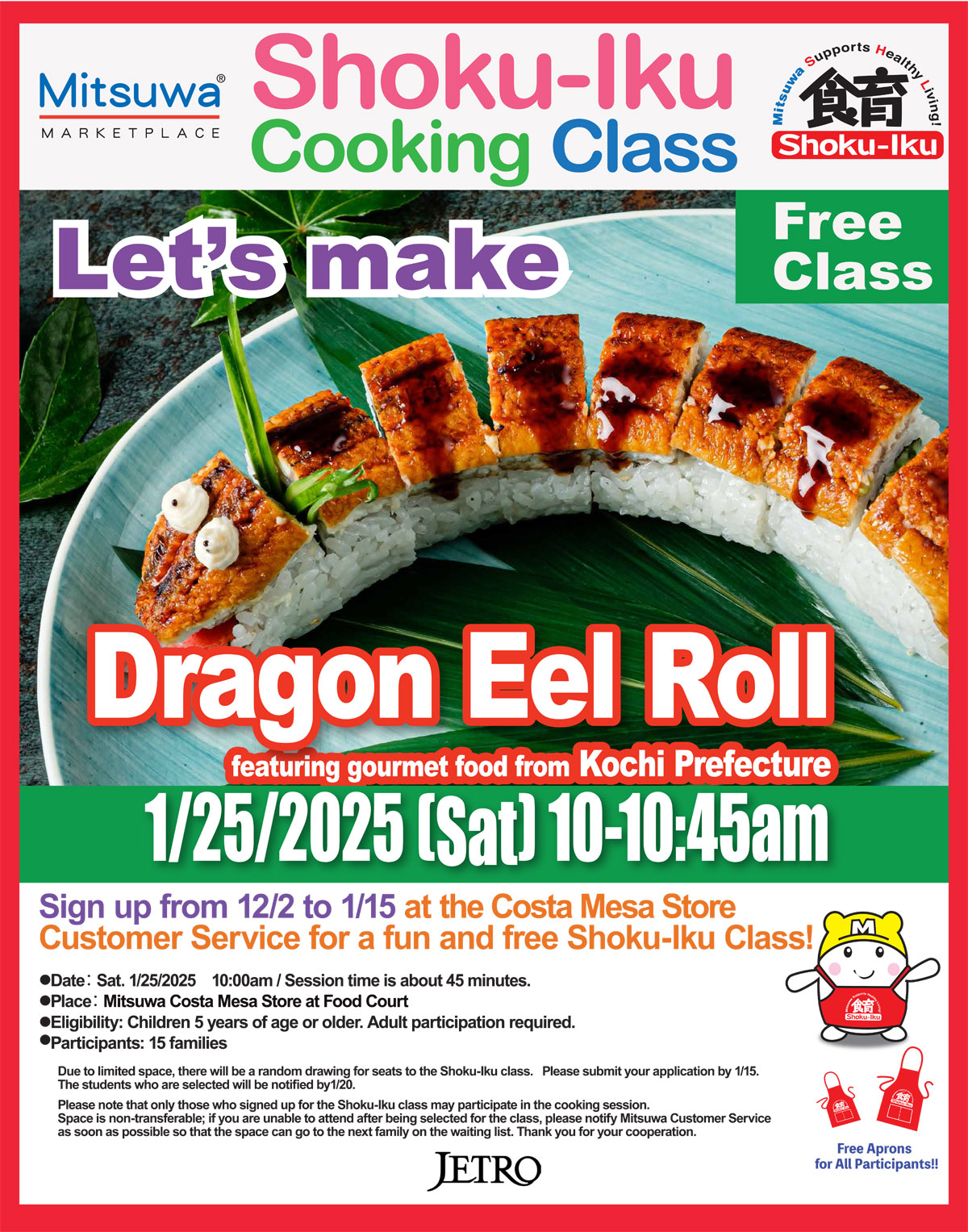 ●米国西海岸への県産品の輸出拡大を図るため、米国Mitsuwa Marketplace コスタメサ店にて高知フェアをコロナ禍後、初開催 ●ユズ加工品や水産物、菓子など県内12事業者の商品を出品 ●1月25日(土)には、ファミリー向けの食育イベントを店内で開催(添付書類参照) ●コスタメサ店でのフェア開催に合わせ、全米の他のMitsuwa店舗(11店舗)でも高知県産品を販売