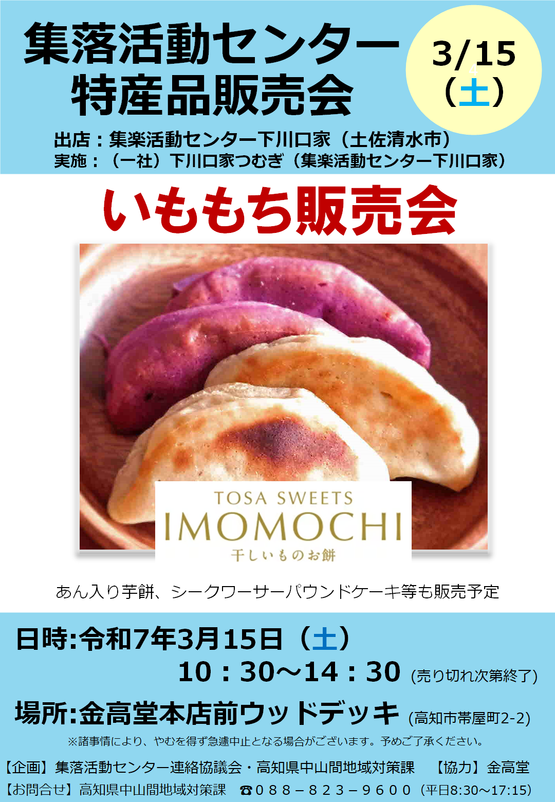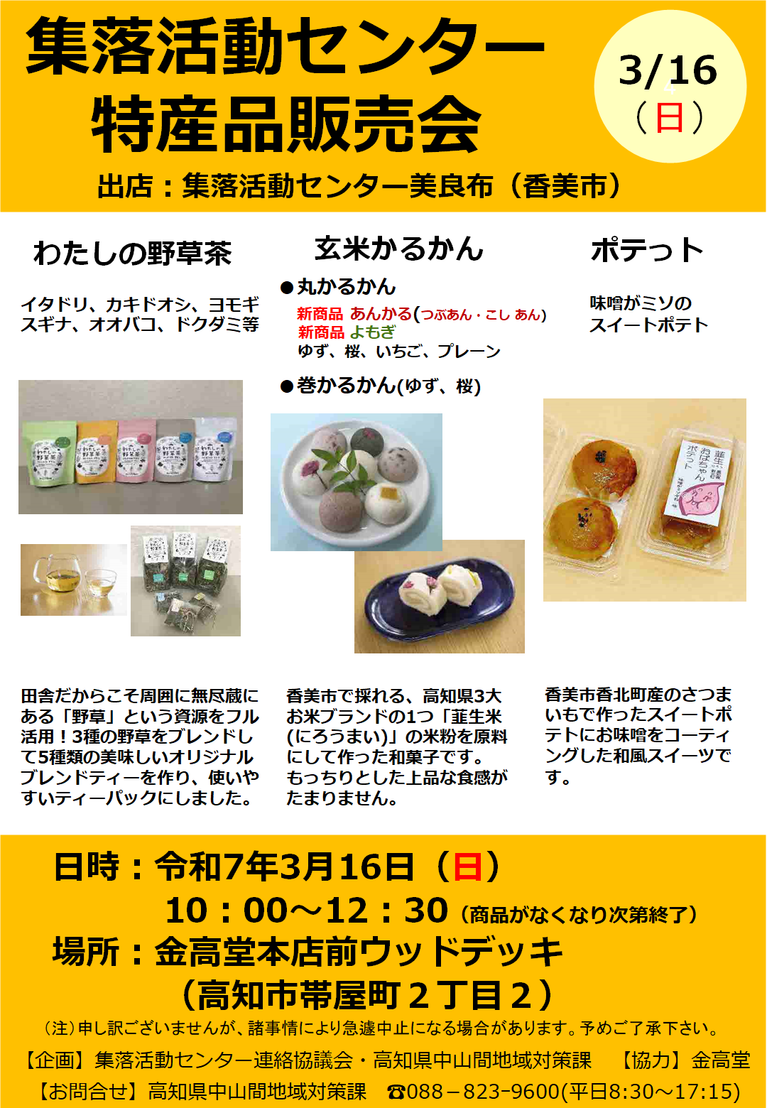 3/15(土) 集楽活動センター下川口家(土佐清水市)による特産品等の販売会 (集落活動センター特産品販売会は今年度16回目) 【販売予定品】 ○TOSA SWEETS IMOMOCHI ○あん入り芋餅 ○シークワーサーパウンドケーキ 3/16(日) 集落活動センター美良布(香美市)による特産品等の販売会 (集落活動センター特産品販売会は今年度17回目) 【販売予定品】 ○玄米かるかん ○野草茶 ○スイートポテト ※集落活動センターポータルサイト「えいとここうち」 http://www.eitoko.jp/