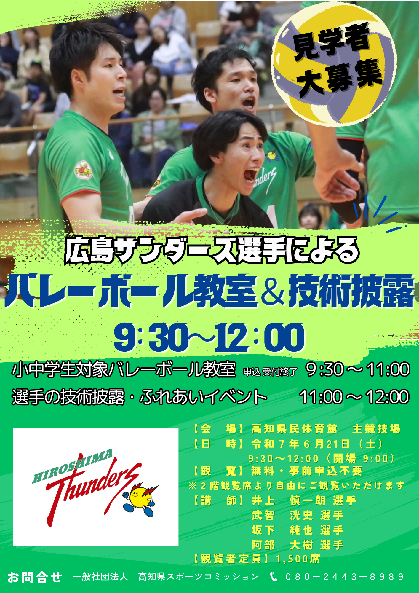 ■知事表敬訪問 (1)日 時 令和7年6月20日(金)15:45~16:00 (2)場 所 高知県庁 本庁舎2階 第二応接室 ■バレーボール教室 (1)イベント名 広島サンダーズバレーボール教室 (2)日 時 令和7年6月21日(土)9:30~12:00 (3)場 所 高知県立県民体育館 主競技場 (4)内 容 バレーボール教室 9:30~ 技術披露・ふれあいイベント 11:00~ (5)参加予定選手 井上 慎一朗(いのうえ しんいちろう) 選手 武智 洸史 (たけち こうし)選手 坂下 純也 (さかした じゅんや)選手 阿部 大樹 (あべ だいき)選手 (6)主 催 高知県・高知市 共 催 高知県バレーボール協会 特別協力 日本たばこ産業株式会社 高知支社 高知商業高等学校 男子バレー部 高知工科大学 男子バレー部
