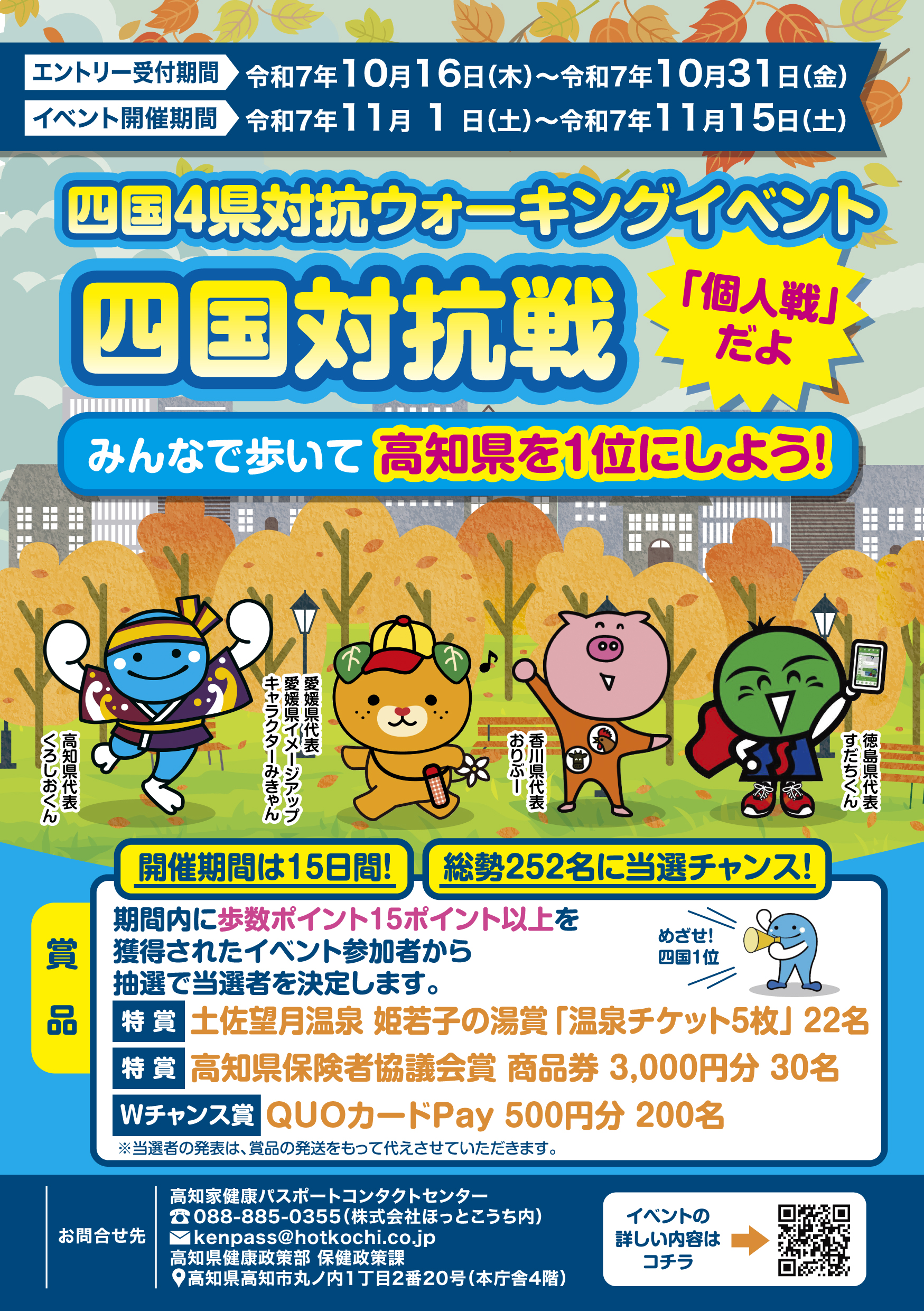 (1)概要 県は、昨年に引き続き、四国4県で同時に、アプリでの「四国4県対抗ウォーキングイベント四国対抗戦」を実施します(四国各県は、それぞれ健康アプリ(高知県は高知家健康パスポート)を運用しており、各県のアプリイベント参加者の平均歩数で、順位を決定します)。 高知県は、このイベントで、「四国一歩く県」を目指します。 (2)イベント開催期間 令和7年11月1日(土)〜令和7年11月15日(土) ※エントリー期間は、令和7年10月16日(木)〜令和7年10月31日(金) (3)イベントルール 四国4県対抗ウォーキングイベント四国対抗戦 各県アプリイベント参加者の期間中における平均歩数によって、四国内の各県の順 位を決定します(ただし、平均歩数を算出する際は一人あたりの1日の上限を5万歩で計算 します)。 (4)賞品 期間中の歩数を元にした「歩数ポイント」を15ポイント以上獲得された参加者には抽 選で賞品が当たります。 特賞:土佐望月温泉 姫若子の湯賞 「温泉チケット5枚」 22名 特賞:高知県保険者協議会賞 商品券3,000円分 30名 Wチャンス賞:QUOカードPay 500円分 200名 ※詳細は別添資料をご確認ください。
