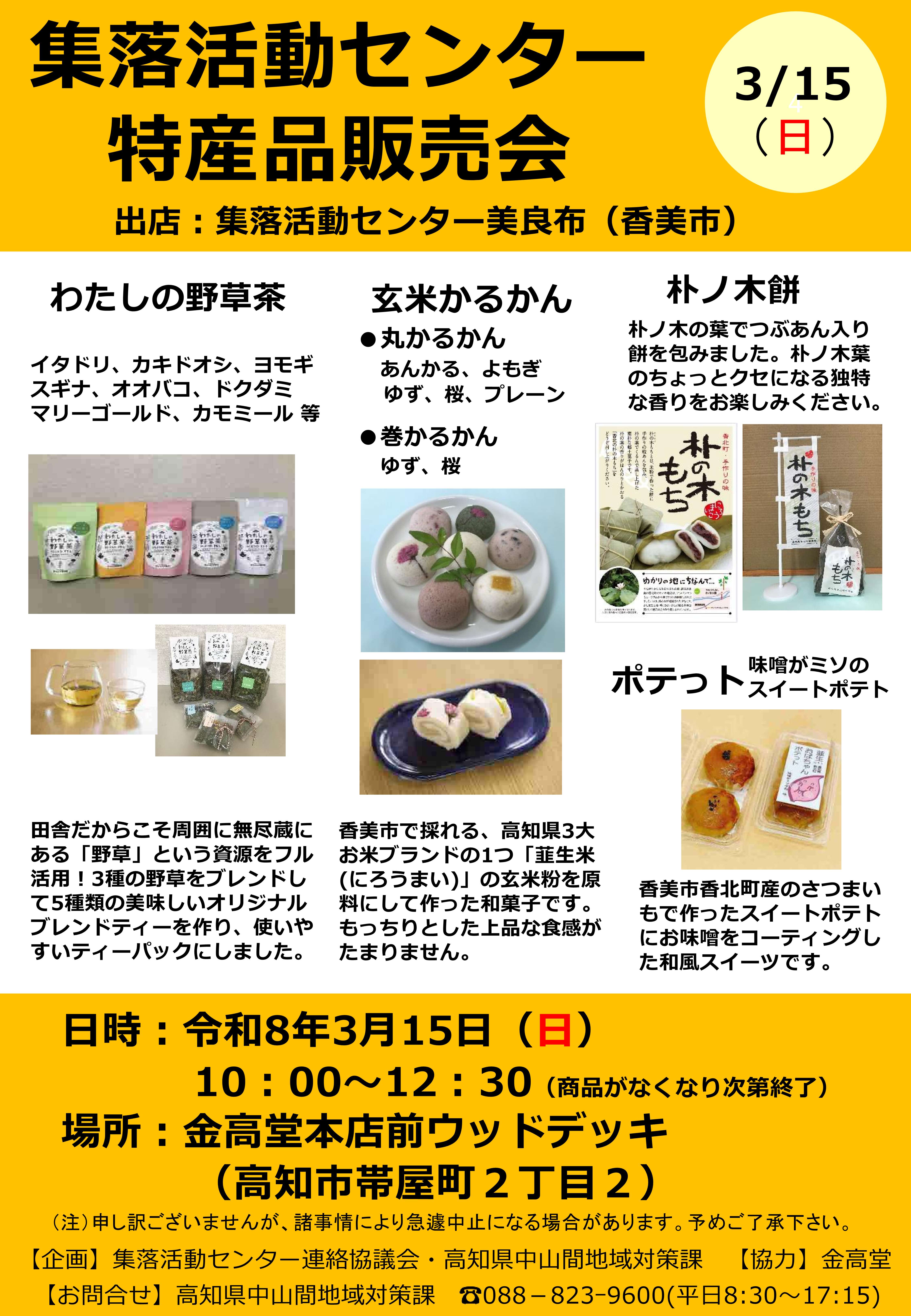 集落活動センター美良布(香美市)による特産品等の販売会 (集落活動センター特産品販売会は今年度14回目) 【販売予定品】 ○わたしの野草茶 ○玄米かるかん ○朴ノ木餅 ○ポテっト ※集落活動センターポータルサイト「えいとここうち」 http://www.eitoko.jp/
