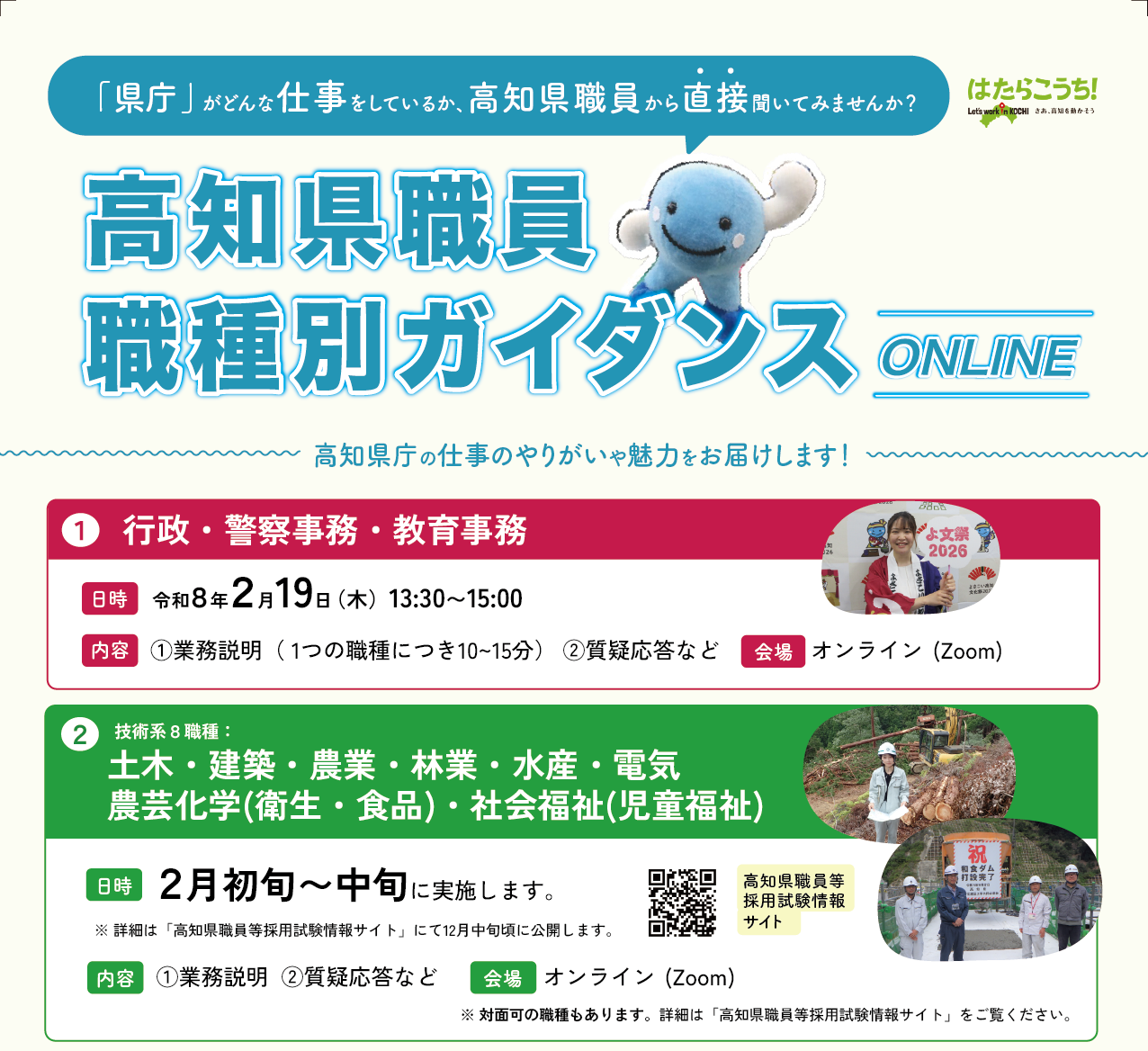 - 2025年12月22日【申込受付中★2月9~20日開催!】「高知県職員職種別ガイダンス」を開催します。