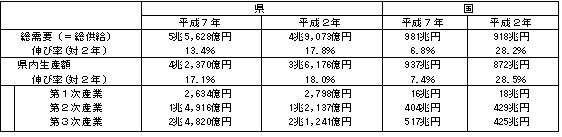 平成2年からの伸び率は総需要(=総供給)が13.4%、県内生産額は