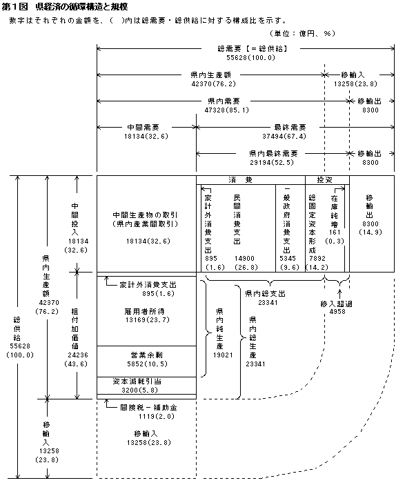 財貨・サービスの総需要(=総供給)は5兆5,628億円、県内生産額は4兆2,370億円であった。