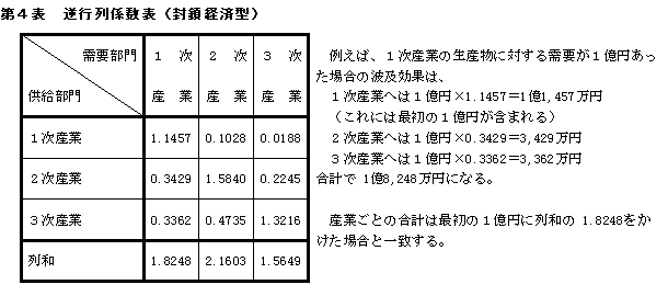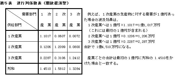 投入係数を使用して計算した波及の倍率が逆行列係数である。県内生産物に対する1単位の需要が直接・間接に引き起こす各産業の生産量(生産額)の大きさ(倍率)を表す。