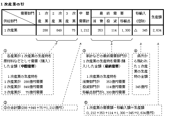 特定の産業に対する最終需要は、中間需要を誘発し、需要が需要を生む形で各産業へ波及していくが、実際には需要の一部は県外・国外からの移輸入によって賄われるので、最終需要及びこれを起点として誘発される中間需要の全てが県内生産に波及するわけではない。