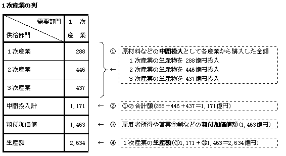 まず、1次産業の縦の列を見ると、1次産業の生産物について、投入構造(生産構造)を読み取ることができる。